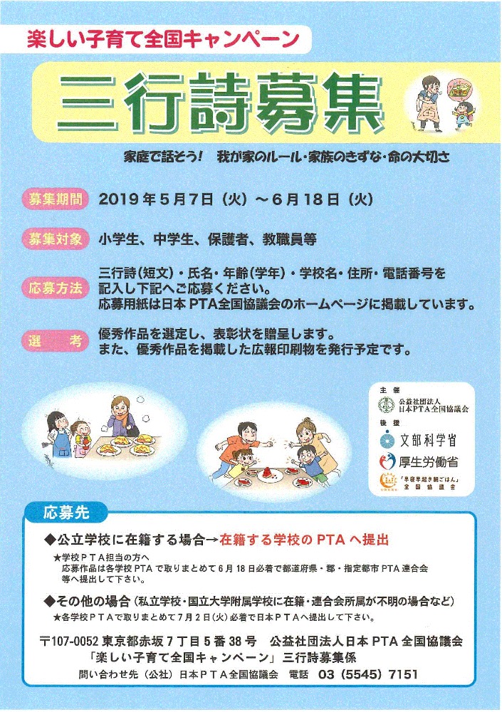 楽しい子育て全国キャンペーン 家庭で話そう 我が家のルール 家族のきずな 命の大切さ 三行詩の作品募集 大阪市pta協議会